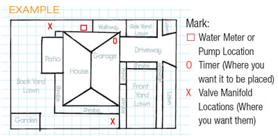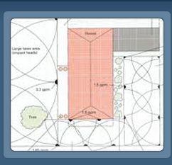 We will then divide your lot into sections such as front lawn, side lawn, flower beds, slopes, etc., and label all areas to be watered. If there are special watering preference such as bubblers in planting beds or a drip irrigation zone we then note accordingly. If there are differences in the amount of sun different areas get we further divide those areas into smaller sections / zones. Depending on the volume of water available we design the system to water using the lowest possible number. Meaning if we only have 10 gallons a minute available then we should only design a system to use 60% - 70% of that water resulting in a lawn sprinkler system that will be using 6 - 7 gallons per minute.
