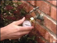 First a pressure guage is attached to an unregulated outside faucet. Then make sure no water is running anywhere inside or outside your home. Turn on the faucet with the guage attached. The guage shows your water pressure in pounds per square inch (psi). This information allows us to design the correct size system for your property. We also need to inspect the meter service size. Usually it is either 5/8" , 3/4" , or 1" in smaller buildings. In larger commercial locations irrigation / lawn sprinkler system meters can be upwards of 2" or 3" meters. If your property is on well water supply it is best to check with the original builder, well company or lawn sprinkler company who installed the well and well pump. Along with needing to know specifically what the recovery rate is for the well itself. Even the most basic of irrigation zones and best lawn sprinkler heads will need 7 - 9 gallons per minute to work and spray properly. Any lower than that and there are a number of possible concerns. Heads do not spray at the most efficiently pattern and do not give the best coverage available. Even with the smallest of lawn and garden sprinkler systems we need to make sure we do not use all available water only for the sprinkler system. If this were the case then we would not be able to flush a toilet or run a shower, or turn on the washer machine.